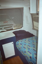 Twin rear beds ( so you don't have to crawl over your partner in the middle of the night) with bureau in between and overhead cabinets, includes very cute "Frog" cabinet handles, stand up shower, extra large kitchen area with extra cabinetry.