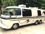 He added exterior modifications: visor, air dam, bumper wraps, head and tail light upgrades, entire coach (original white) was stripped and redone custom in 2007. He also started the interior upgrades with flex steel captains and rear beds, granite counter on kitchen and removed the oven/stove (we cook outside mostly with grill and electric skillet). Replaced toilet with new.