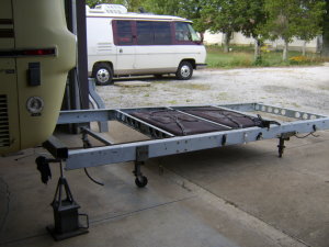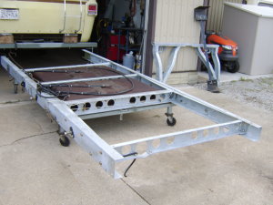 How do you know if you need a new frame? Along the underside of the two long frame rails looking toward the front of the coach, if the lower flange has been bent upward, it’s no big deal-it means someone has tried to jack the coach up in the wrong place. (The only place you jack up the rear of a GMC is by placing the jack under the bogey bracket.) If however, the lower flanges are bent downward, that’s bad news; you have major rusting in the area where the bogey H-frame nestles inside the side rails, and in most cases that rust cannot be seen until the old frame is dismantled. When it is taken apart, there will be slabs of rust as big as a good-sized steak and a half inch thick, many of them. Some guys have said they only need new rails at that point. Not so. I have yet to see a frame in that condition that didn’t need the H-frame also. Now, as a matter of course, I always put brand new H-frames in as well as new forward cross members. Sometimes when my customers come to pick up their coach they wonder if they really needed to go to the full extent of a new frame. To answer their scepticism, I’ll rattle their old frame apart with the impact gun and show them. It tends to get their attention when they see the mess laid bare. Another place to look is where the rear subframe bolts on to the rear of the side rails on both sides. Gravel and dirt tends to collect in the vee and after poking the debris out, there will probably be perforation visible around the bolts. This area becomes even more important if the owner intends to tow a car because this part of the frame carries a major part of the structural work in towing. The original frame components on our coaches were mostly 1/8” mild steel. There is evidence that GM did use some type of paint on them, but it’s doubtful that they ever expected the motorhomes to be on the road much more than 15 or 20 years. The first 30 or so frames that I built, after cutting, drilling and welding everything together, were sandblasted and coated with a two-part epoxy primer and then painted. The paint mainly to cover up the ugliness of the sickly green primer. That system worked OK and the frames will last a long time, but I wasn’t satisfied that it was the best way to preserve the steel. Since the largest galvanizer in North America is about 2 hours from my shop, I decided to talk to them. All my frames have been galvanized from that point on. There are several grades of galvanizing and my GMC frames have the same as used for culverts and guard rails. They won’t rust away soon. In addition to galvanizing, I have, from the first, been using 3/16” heat treated steel with close to twice the tensile strength of the original. Also, the flanges are almost 3” wide compared to the original 2 1/2”. Where the inner frame components nestle inside the side rails, I paint them with grease which helps them slide together and is more insurance against the rust worm. Any coach that has spent much time in the salt air of the coastal regions, salted roads of the northern states and Canada, or sat on grass “behind the barn” will need frame attention. For those contemplating buying a GMC, the fact that a coach needs a new frame should not discourage you from making the deal. Just factor the cost of that new frame into the price you negotiate. How long does it take to put a new frame under a GMC? It takes me about 120 hours spread out over 3-4 weeks if I have a new frame ready to go ahead of time. If not, factor in another week or two to order in the steel, do the fabricating and take it to the galvanizer. Buskirk used to claim a 40 hour time frame with two experienced guys working together, which seems about right. Some guys want to do the install themselves which is fine with me. They’ll save some money and I’m happy to coach them over the phone as I have done several times.