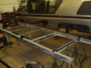 How do you know if you need a new frame? Along the underside of the two long frame rails looking toward the front of the coach, if the lower flange has been bent upward, it’s no big deal-it means someone has tried to jack the coach up in the wrong place. (The only place you jack up the rear of a GMC is by placing the jack under the bogey bracket.) If however, the lower flanges are bent downward, that’s bad news; you have major rusting in the area where the bogey H-frame nestles inside the side rails, and in most cases that rust cannot be seen until the old frame is dismantled. When it is taken apart, there will be slabs of rust as big as a good-sized steak and a half inch thick, many of them. Some guys have said they only need new rails at that point. Not so. I have yet to see a frame in that condition that didn’t need the H-frame also. Now, as a matter of course, I always put brand new H-frames in as well as new forward cross members. Sometimes when my customers come to pick up their coach they wonder if they really needed to go to the full extent of a new frame. To answer their scepticism, I’ll rattle their old frame apart with the impact gun and show them. It tends to get their attention when they see the mess laid bare. Another place to look is where the rear subframe bolts on to the rear of the side rails on both sides. Gravel and dirt tends to collect in the vee and after poking the debris out, there will probably be perforation visible around the bolts. This area becomes even more important if the owner intends to tow a car because this part of the frame carries a major part of the structural work in towing. The original frame components on our coaches were mostly 1/8” mild steel. There is evidence that GM did use some type of paint on them, but it’s doubtful that they ever expected the motorhomes to be on the road much more than 15 or 20 years. The first 30 or so frames that I built, after cutting, drilling and welding everything together, were sandblasted and coated with a two-part epoxy primer and then painted. The paint mainly to cover up the ugliness of the sickly green primer. That system worked OK and the frames will last a long time, but I wasn’t satisfied that it was the best way to preserve the steel. Since the largest galvanizer in North America is about 2 hours from my shop, I decided to talk to them. All my frames have been galvanized from that point on. There are several grades of galvanizing and my GMC frames have the same as used for culverts and guard rails. They won’t rust away soon. In addition to galvanizing, I have, from the first, been using 3/16” heat treated steel with close to twice the tensile strength of the original. Also, the flanges are almost 3” wide compared to the original 2 1/2”. Where the inner frame components nestle inside the side rails, I paint them with grease which helps them slide together and is more insurance against the rust worm. Any coach that has spent much time in the salt air of the coastal regions, salted roads of the northern states and Canada, or sat on grass “behind the barn” will need frame attention. For those contemplating buying a GMC, the fact that a coach needs a new frame should not discourage you from making the deal. Just factor the cost of that new frame into the price you negotiate. How long does it take to put a new frame under a GMC? It takes me about 120 hours spread out over 3-4 weeks if I have a new frame ready to go ahead of time. If not, factor in another week or two to order in the steel, do the fabricating and take it to the galvanizer. Buskirk used to claim a 40 hour time frame with two experienced guys working together, which seems about right. Some guys want to do the install themselves which is fine with me. They’ll save some money and I’m happy to coach them over the phone as I have done several times.